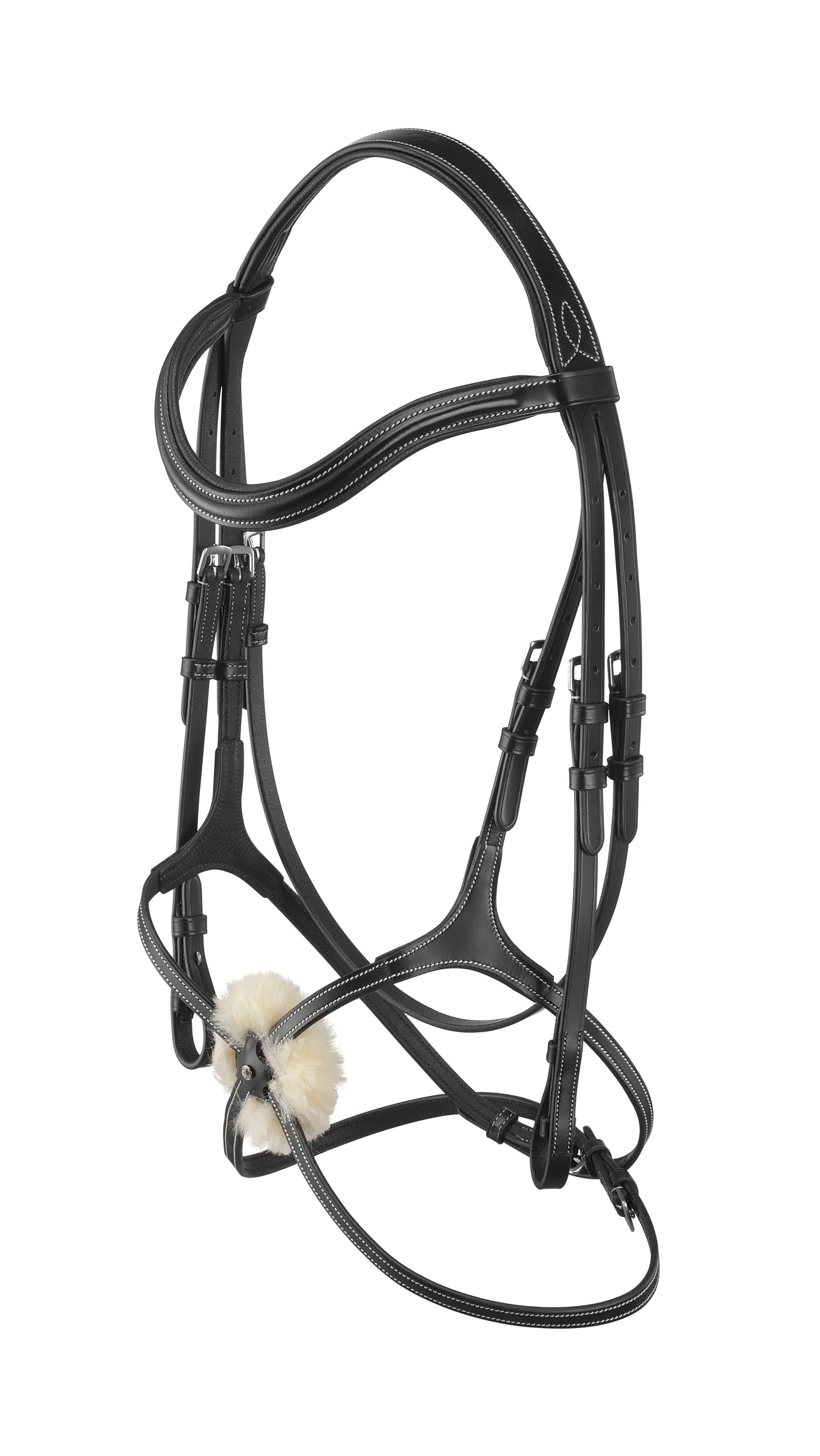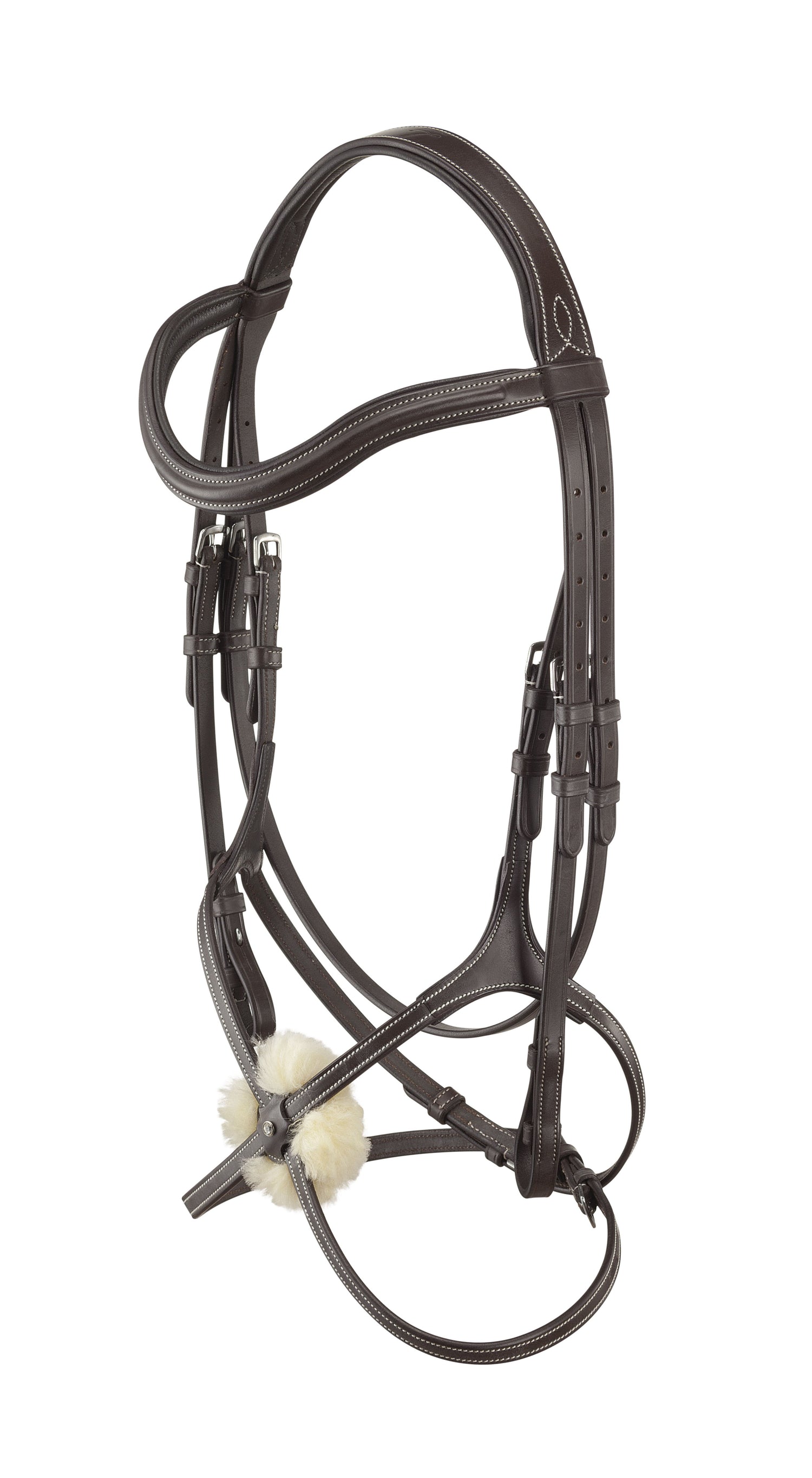 MEXICAN BRIDLES MADE OUT OF ENGLISH LEATHER, anatomic anti-stress headstall with figure 8 noseband and fancy-stitched browband.